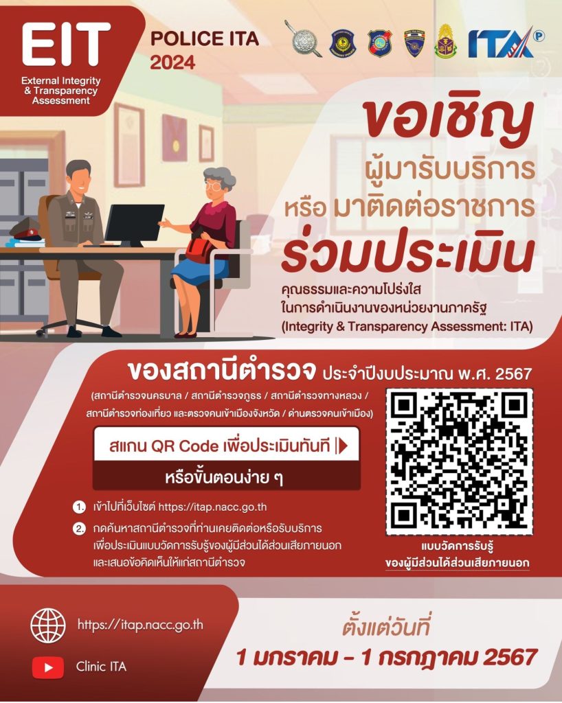 สถานีตำรวจจภูธรบ้านหัน ขอเชิญผู้มาติดต่อราชการร่วมประเมินคุณธรรมและความโปร่งใสในการดำเนินงานของหน่วยงานภาครัฐ (Integrity & Transparency Assessment: ITA) ของสถานีตำรวจประจำปีงบประมาณ พ.ศ. 2567 สถานีตำรวจภูธรบ้านหันขอขอบคุณทุกท่านมา ณ โอกาสนี้ด้วย